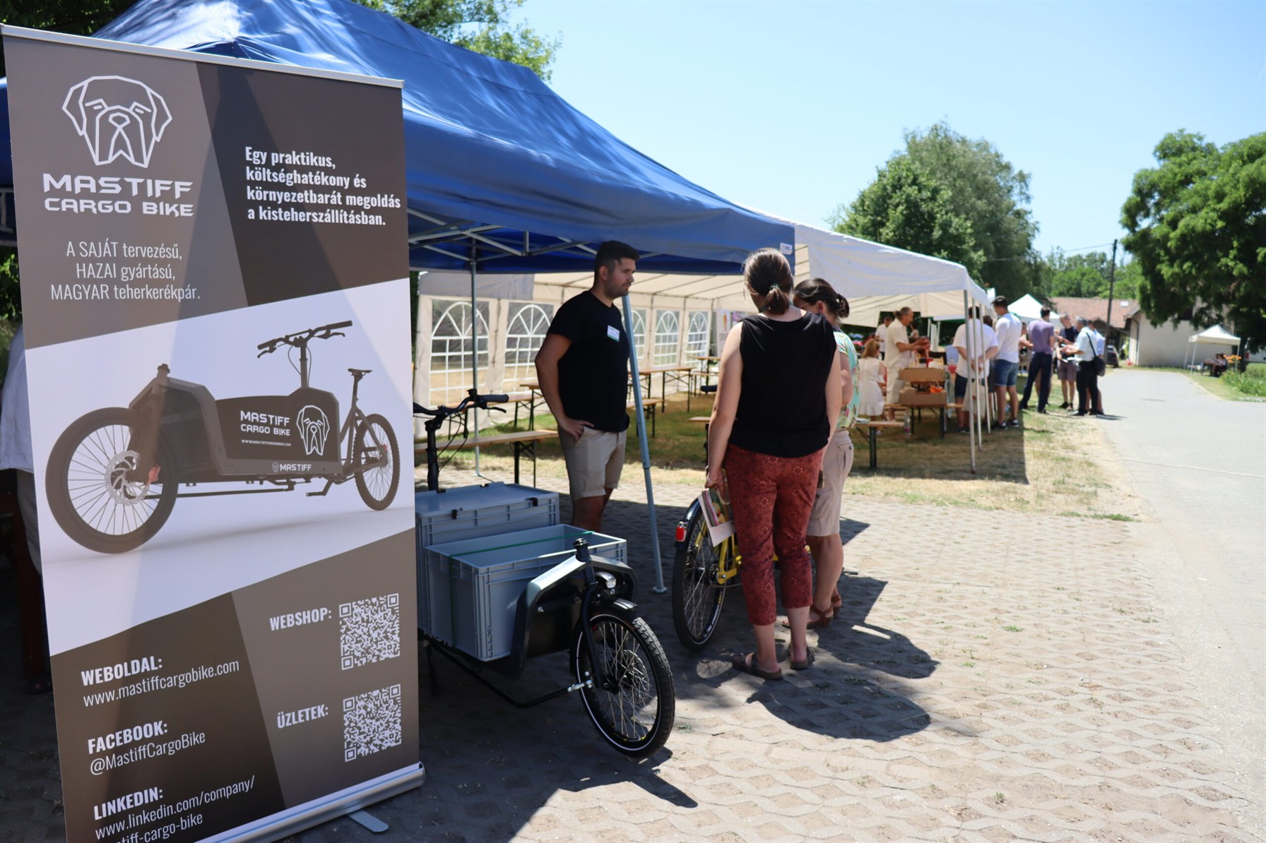 Szállításra alkalmas teherbicikli bemutatása a kiállítók között