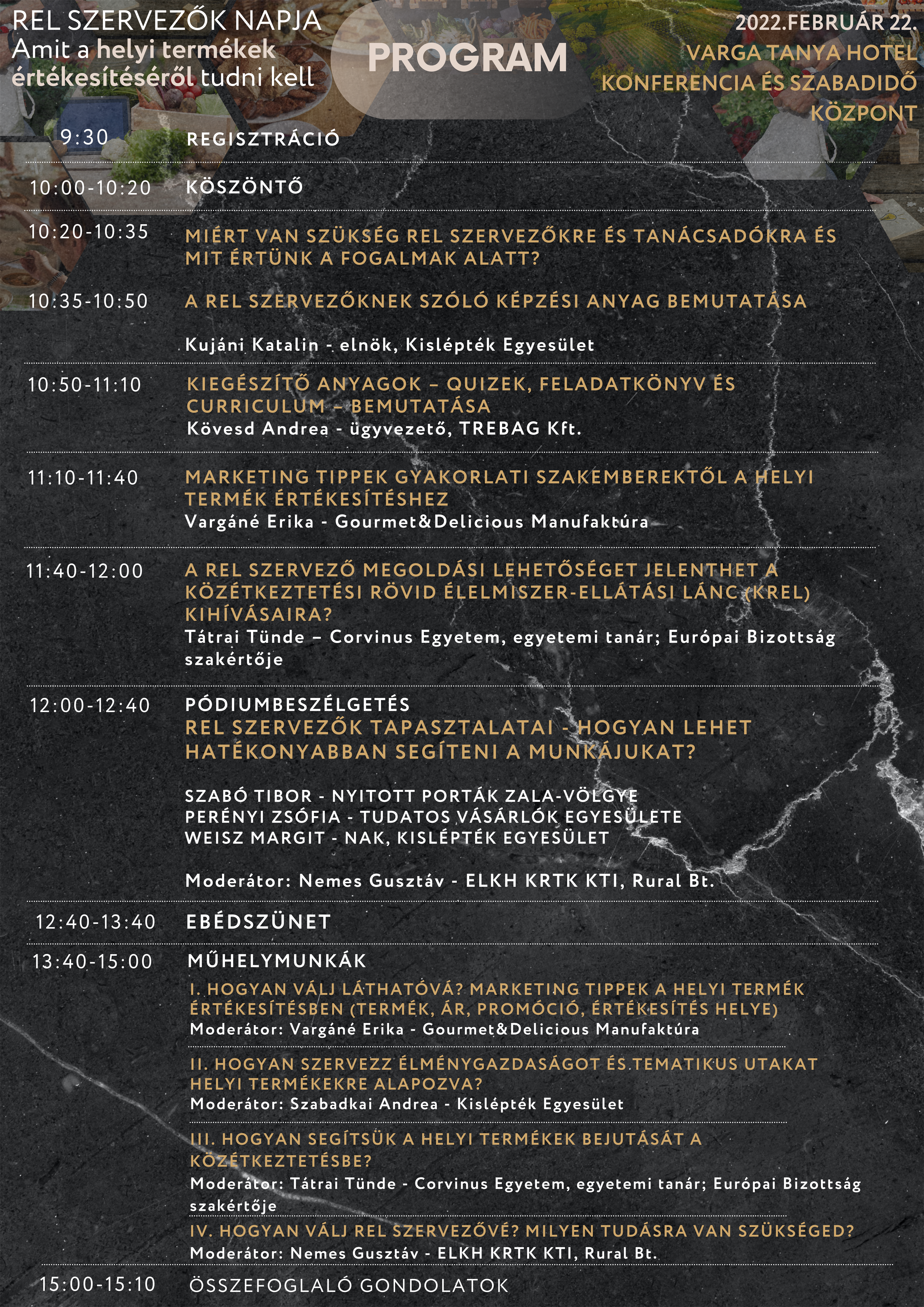 A rövid ellátási lánc szerepének erősödése felfedte a fogyasztók helyi termékek iránti igényét. Éppen ezért nem feledkezhetünk meg az ellátási láncok mozgatórugóiról. A piacszervezők, a kosárközösségek tagjai, szervezői, a termelők, illetve mindenki, aki kapcsolatot teremt a fogyasztók és a termelők között vagy bármilyen formában segíti a folyamatot kulcsfontosságúak a REL szervezésében és működtetésében. A REL szervezők napját nekik szervezzük. Ezen az eseményen minden olyan téma előkerül majd, ami leginkább érdekli az érintetteket, annak érdekében, hogy létrehozzunk egy olyan hálózatot, ami tudásbázisául szolgálhat a hazai rövid ellátási láncokkal foglalkozók munkájának.