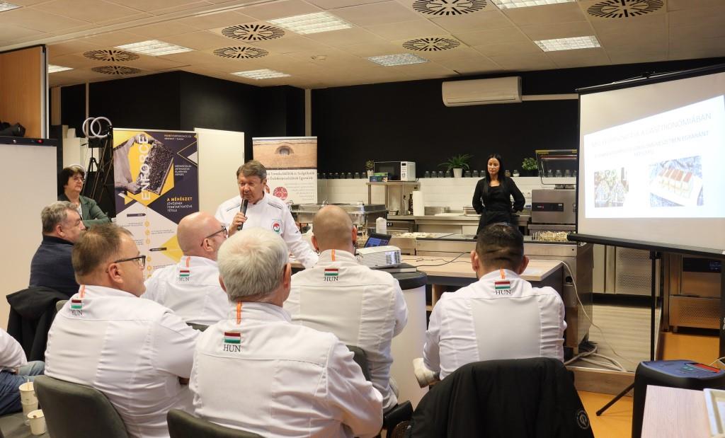 Andrea Kövesd, Head of Trebag Trebag Szellemi tulajdon- és Projektmenedzser Ltd and our colleague Viktória Nagy presented the Enforce project and explained why it is worth following the results of the project. We also brought the honey cookbook from our project partners to show the Chefs. Miklós Várhelyi, master chef and professional teacher, introduced the participants to the secrets of using honey in the kitchen, e.g. fruit glazes and roasted meats can get a bright coating from honey, in addition to the fact that honey can also highlight the character of dishes with its flavour.