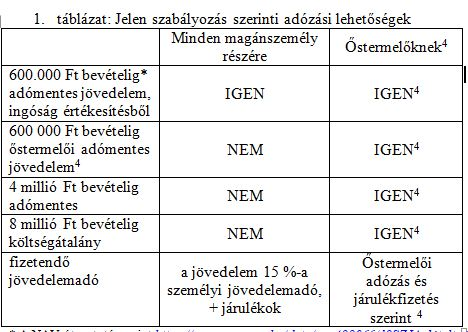 A termelők – mint minden adóalany – a számukra legkedvezőbb adózási formát választják. Az üzleti tervezés egyik alapja ez. Az 1. táblázat áttekintést nyújt a egyes jelenlegi választható adózási kategóriáiról.