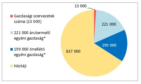 A következő 1. ábra jól mutatja, hogy a Magyarországon gazdálkodók között legtöbben ma is azok a legkisebb termelők vannak, akik a háztájin, a zártkertben, a tanyához tartozó kis földterületen termelnek. Az egyéni gazdálkodók egy része az önellátás mellett a felesleget értékesíti (199.000 fő), és végül vannak olyan termelők, akik elsősorban a piacra viszik termékeiket (221.000 fő). A mezőgazdasági tevékenységet folytató társas vállalkozások száma 13.000.