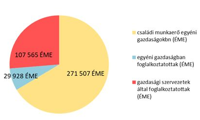 Megjegyzés: A Magyar mezőgazdaság és élelmiszeripar számokban 2016 (NAK) szerint 439.900 ÉME, a KSH 2018 szerint 405.000 ÉME. A KSH 2016 előzetes GSZÖ adatok szerint 416.000 ÉME. ÉME = évi 1800 óra tevékenység.