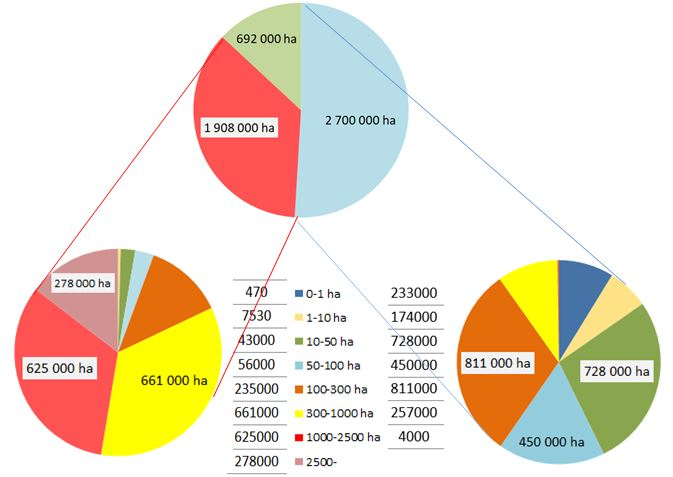 5. ábra. Szemből a BAL alsó diagram: A gazdasági szervezetek általművelt terület nagyága (100%=1,9 M ha) birtokméretenként (hektár=ha)